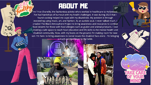 I'm Trice Chanelle, the fashionista activist who's worked in healthcare to Hollywood. I've had hardships of burnout with my health challenges. It was during 2023 that I found cooking helped me cope with my disabilities. My activism is through storytelling using music, art, and fashion. As an autistic soul, I never talked much. I created The Black Atmosphere Project to bring awareness and resources to combat food deserts for those with food allergies such as gluten and animal products. I love creating a safe space to teach food education and life skills to the mental health and disabled community. Now, with my boots on the ground, I'm making room for new soil. I'm here to bring awareness to social issues the disabled face alone. I'm bringing a much-needed flavor to the table.